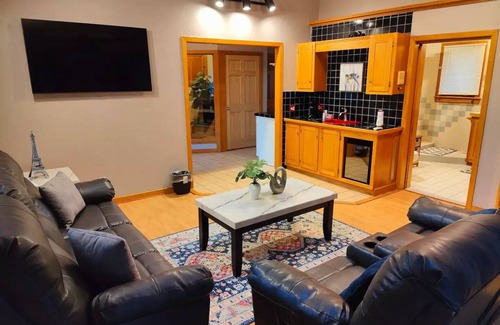This attached suite gives you access from within the main house as well as having a private entrance. It features a spacious living room with recliner sofas and a smart TV.