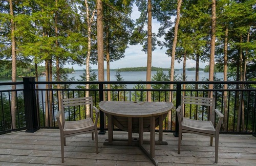 PLAYFAIR ISLAND's main cottage is surrounded by towering trees, giving you beautiful lake views and privacy with a gradual walk down steps to the boathouse and waterfront. It is an ideal landscape for guests of all ages to enjoy with ease. The property has 492' of waterfront, multiple outdoor seating areas at the boathouse dock to lounge and catch the sun throughout the day. Off the main floor of the cottage is the wrap-around cottage deck. From the lower level, walk out to the stone encased fire-pit with surrounding chairs. The dock features ample seating for the whole group to assemble and enjoy the all-day sun, including an outdoor living room set and umbrella on the upper-level boathouse deck, as well as a bbq, four Muskoka chairs and two loungers at the dock's edge. The 2-slip boathouse includes an upper-level kitchenette with a sink, mini-fridge, wine fridge, and portable electric burner, providing easy access to snacks and drinks throughout the day. Perfect swimming conditions with a sandy walk-in at the beach and deep water at the end of the dock.