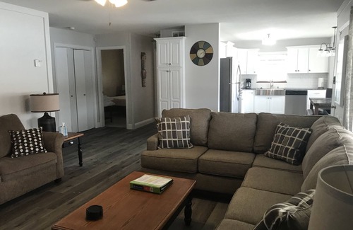 Perfect for swimming, fishing or just relaxing. Living room has plenty of lounging area. Kitchen is fully equipped, kitchen table seats 6+. You may want to dine on the dock with a table setting for 6 with additional seating at the bar plus additional outdoor furniture. There is also additional seating/dining area on the porch. The porch also features a full sized refrigerator. Dock has gas grill and mini refrigerator, another charcoal grill is located on side of house. Located less than 10 minutes to town and close to attractions. Many waterfront restaurants within a few miles by land or water.