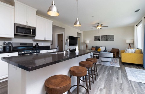 Our backyard features private fully fenced in backyard, a propane fire pit surrounded by a couch and four chairs for relaxing. For entertainment, the living room as well as each bedroom has a smart TV. We've included multiple games and a fully equipped kitchen for comfortable hangouts and dining in.