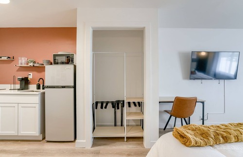 Enjoy a peaceful stay at this phenomenal motel boutique in Lincoln. The cozy room features 2 comfortable queen beds with plush pillows, WiFi, heating, AC, a desk, a full-modern full-size bathroom, a stovetop, a single-serve coffee maker, kitchen essentials, a mini upright fridge with a freezer and a outdoor space with lounge chairs and a pickleball court. We think our will help you experience everything Lincoln has to offer.