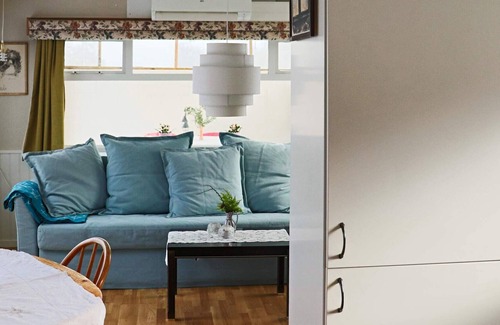 A very pleasant cottage, rurally located and surrounded by lovely nature. Here you live peacefully and close to nature with nice walking paths and a forest filled with berries and mushrooms. Walking distance to Bönarpesjö, where your rowing boat is located. Proximity to Varberg's fine summer town and to Gekå's fantastic shopping center in Ullared. A well-planned and compact accommodation with shared plot. The cottage is a converted mobile home on the owner's agricultural property. There is one bedroom with a double bed and one with a single bed. The bathroom is compact with a shower and washing machine. The kitchen is well equipped and open with a dining area and a spacious living room with a comfortable sofa bed for two people. There is a TV with no channels, but the cottage has free wifi. The extension has a glazed conservatory and exit to a balcony with a lovely view of pastures and the beautiful lake. Bönarpesjö has a population of pike, perch and roach. If you are lucky enough to fish, you might be able to grill the catch for your evening meal. There are many nature experiences and excursion destinations in the area. An exciting one is Borrås skåra, a dramatic 10 meter deep and 100 meter long cleft in the mountain just outside Varberg. Åkulla bokskogar is a fifty square kilometer nature area located in the interior of Halland, about 20 km east of Varberg. Within the area you will find breathtaking lookouts, around twenty lakes and twelve nature reserves. It is considered one of Sweden's foremost beech forest areas. The pleasant summer town of Varberg is only a short drive away. The city with lovely salty baths, both with and without clothes, from both sandy and rocky beaches. There is also a large range of culture here, famous market stalls on Wednesdays and Saturdays and plenty of cozy restaurants and cafés. Varberg is also Sweden's SPA city with numerous bathing facilities. Varberg is best known for its magnificent fortress and museum, with i.a. the buckstone man and the bullet button that killed Karl X11. Next to the fortress there is a large newly built fortress bath and an incredibly beautiful Kallbadhus where there are bathing opportunities all year round. Right next to it is the fine Societetshuset and a 100-year-old Warm Bath House with a wide range of activities and entertainment. The nearest golf course is Harabäcken Gk's fine golf club.