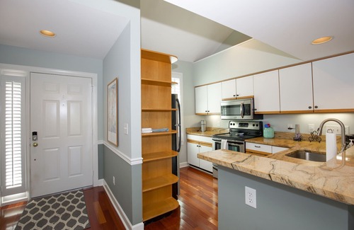 Additional amenities include a washer and dryer and a K-Cup coffee machine in the kitchen. Please note that steps are required to access the front door, and parking is first come, first served.