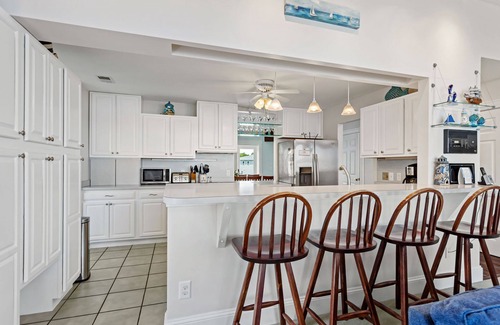 Make your way up to the Top Level for even more soundfront enjoyment. Gather around the 65” Flat Screen TV in the spacious Living Area with incredible views of the Sound, a Queen-size Sleeper Sofa, an Intercom System w/CD Player & Radio, and Kitchen Bar Seating for 4 as well as access out onto the Top-Level Deck where you can enjoy the calming breezes coming off the water and the sound of the birds as they fly through the sky at sunset. You'll find a nearby Hallway Half Bathroom for everyone's comfort and be sure to enjoy the easy access to this level from the centrally-located Elevator. Cook up your own fresh catch in the Kitchen with Stainless-Steel Appliances to enjoy in the sunny, large Dining Area which includes seating for 12, a built-in buffet, a pass-through counter to the Kitchen, and access to the Deck. And for those rainy days or evenings when you just want to spend some time together as a family indoors, you'll find plenty of board games and puzzles just waiting for you in the buffet. And when you need more space for that special family dinner, you'll find seating for 6 more in the Breakfast Room complete with views of the sound. For a little extra privacy and luxury, the King Master Bedroom on this level offers Deck Access and Soundfront Views, a Flat Screen TV, 2 Walk-In Closets, and an attached Handicapped-Accessible Master Bathroom with a Whirlpool Tub, Separate Shower, Bidet, Double Sinks, and views of the Sound.
