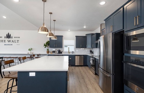 The Walt is a beautifully designed, NEW in 2023, 6 bedroom lodge that feels like you’ve gotten away from it all, yet is convenient to Table Rock Lake, Branson, and all the area has to offer! Located in the Crowne View Estates neighborhood, with 6 Bedrooms, all with ensuite bathrooms, plus an additional half bath, fun activities, an incredible kitchen, and comfortable beds to sleep 17 guests, it is the perfect home base no matter what brings you to the Ozarks!