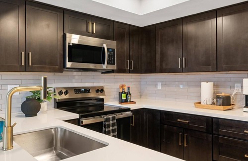 The fully equipped kitchen offers modern appliances, ample counter space, and all the essentials to prepare meals.