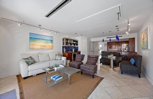 After a day of beachside enjoyment, unwind in the open-plan living room or step onto the covered patio, thoughtfully furnished for relaxation. This inviting space is perfect for sipping morning coffee, enjoying the refreshing sea breeze, or watching the serene sunrise over the water.