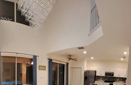 High-end luxury villa sleeps 16+! Amazing 6 bedroom 6 bathroom home in an upscale resort community close to all theme parks. Marble countertops, 10ft and 9ft crystal chandeliers, new appliances, private pool and hot tub, and WiFi.