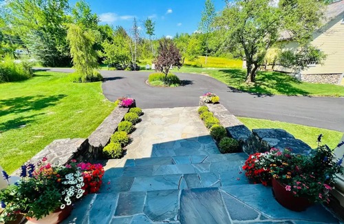 Swiss-style 5BR/5BA 5200 sq ft enchanting villa in the heart of Manchester on 4 stunning acres. Accommodates 15-20 guests with a ground-level bedroom and full bath. The villa offers a billiards room, high speed Wi-Fi, office, basketball, hot-tub, deck, fire-pit, grill, table tennis and bar. Bask in a 2000 sq ft wood barn adorned with fairy lights. Short walk to everything. 3hr drive from NYC/Boston. Stocked with towels, sheets, cookware. Professionally cleaned. Great for large groups.