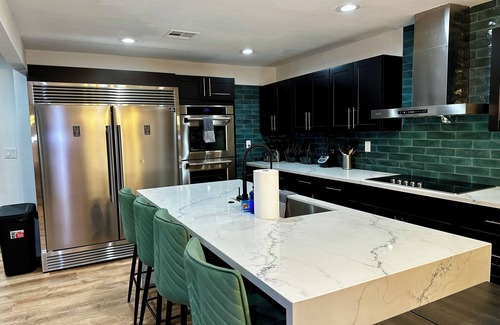 Welcome to The Peacock Inn by vegas-bnb, a spacious retreat, offering approximately 3,200 sqft of indoor opulence and 2,000 sqft of outdoor entertainment on a half-acre lot. Upon arrival, our spacious living room welcomes you with 3 sofas, 3 chairs (seating 9), an 85-inch TV, and a dining area for 8, complemented by countertop seating for 4. The modern kitchen, equipped with dinnerware for 18 and all essential cooking and bakeware, ensures a delightful culinary experience.