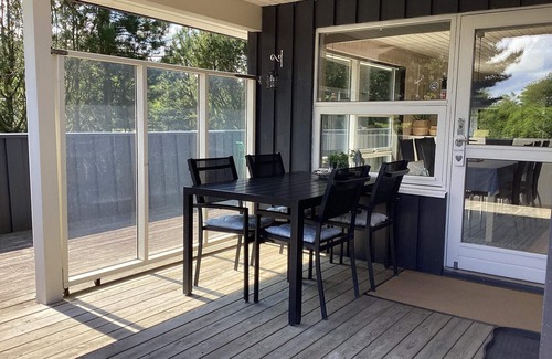 Layout: Sitting room(double bed), Kitchen(cooker(2 ring stoves), coffee machine, oven, microwave, dishwasher, fridge(+ freezer)), Living/bed room(TV(german television channels, danish TV channels (DR1 and TV2), norvegian TV channels , swedish TV channels)), bedroom(double bed), bedroom(double bed), bedroom(double bed), bedroom, bathroom(washbasin, shower, toilet), heating(electric), terrace, garden, garden furniture, garden furniture, play equipment