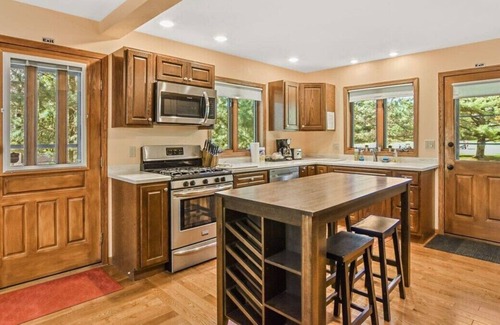 8th Haven is your refuge away from home! Peaceful, modern property located in Lake Arrowhead neighborhood. A wonderful getaway whether you are golfing, swimming, boating, biking, skiing, or just relaxing at the house all week. You’ll love the deck/patio where you can grill out, play yard games, enjoy a fire, or people watch as the golfers make their way through the 8th hole of the Pines golf course. In addition to enjoying the outdoors, the inside of the house has a lot to offer as well. The kitchen/dining area is fully stocked for your cooking/grilling needs and includes a kitchen island that comfortably sits 4 people and a dining room table that comfortably sits 6. The living room has vaulted ceilings with transom windows for loads of natural light open to the 2nd floor hallway above. The room includes a beautiful stone fireplace with wood burning stove and walks out to the deck overlooking the golf course. Enjoy watching the big game or your favorite movies on the 55” smart-TV. You can even play cards or put together a puzzle on the pub table in the back of the spacious living room.