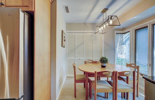 A few steps lead to the front door and into this beautiful 3 bedroom, 3 bathroom villa with a ton of natural light and comfortable furnishings. The main great room features an open concept dining and living area with high beamed ceilings. The great room offers a large L-shaped sectional couch, a flat screen TV, a dining table with seating for 8, and access to a patio. The patio provides a comfortable outdoor dining option with a propane grill and spectacular lagoon views offering a unique eye on the natural beauty of Hilton Head Island. The kitchen is fully equipped with newly upgraded appliances and contains an additional dining space with seating for 6. The kitchen also features a large pantry and laundry closet with a washer and dryer.