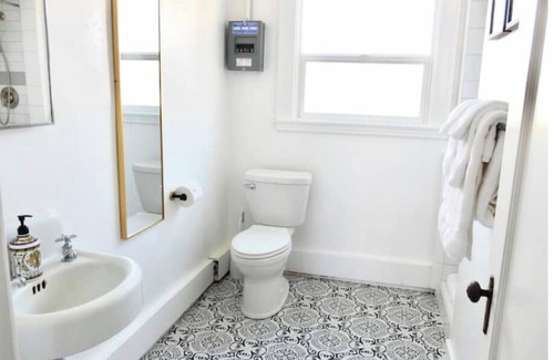 This apartment is a single room with a Queen sized bed, a microwave, toaster, and coffee pot, and a bathroom with the charming original 1930’s touches like the newly restored hardwood floors, Art Deco style doorknob, speakeasy peek window at the front door, and the original bathroom sink with separate hot and cold water faucets! We updated the tile in the bathroom (floors and shower) but tried to keep the historic vibes!