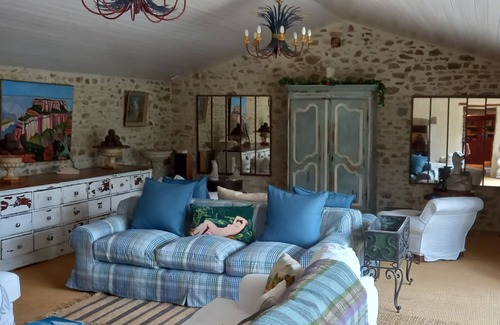 The huge sitting room opens onto the courtyard and is ultra comfy, with 4 large sofas, armchairs, TV, DVD, hi-fi (a collection of vinyl...) and a log burner for chilly evenings.