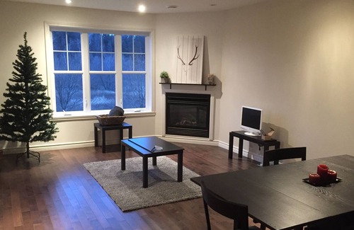 You want to stay in beautiful Bromont? Great idea! But where. Many of the offered accommodations are far from the action, and not convenient for a truly enjoyable stay. The apartment we have for rent is located steps away from the Old Village, from the all the shops, services, and is yet very close to the golf courses, equestrian centers, the mountain and its various activities (mountain biking, ski in the winter, etc.). The Ski Bromont resort is of course outstanding. The apartment features three bedrooms, a living room (with sofa bed), two bathrooms and a kitchen, plus a wood terrasse for BBQ etc. You also have access to a small garden. It is extremely convenient, in a very quiet area, and will allow you to have a feeling of being in the country side, yet you will actually be steps away from everything. There is central heating and air conditioning, wooden floors, etc.. The unit is part of a classy 4 plex built in 2010.