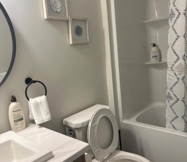 BathroomTowels, Private bathroom, Free toiletries, Toilet paper, Body soap, Bathtub, Bathtub or shower, HairdryerMedia & TechnologyFlat-screen TV, Streaming service (like Netflix), TVGeneralIron, Key access, Heating, Smoke Alarm, Trash cans, Private entranceKitchenWashing machine, Toaster, Cleaning products, Coffee machine, Electric kettle, Refrigerator, Kitchenette, Microwave, Dining table, Stovetop, Wine glassesLiving AreaSofa, DeskAccessibilityEntire unit located on ground floorRoom AmenitiesSocket near the bed, Clothes rackFood & DrinkChocolate/Cookies, Bottle of water |