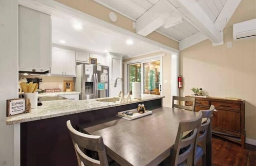 Nestled in the heart of nature, our delightful retreat offers three inviting bedrooms designed for ultimate comfort. Two of the bedrooms feature queen beds, each with its own private bathroom—one conveniently located on the main level off the spacious living area, and the other on the second level for added privacy. The third bedroom is a fun kids' bunk room, equipped with a trundle bed that can sleep up to three, making it perfect for family stays.