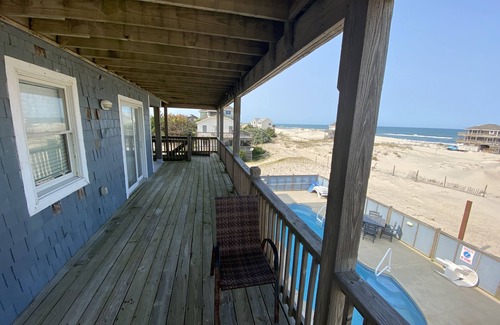 Views, views and more views! Come stay at this beach paradise. Relax and watch the dolphins play in the surf, take a stroll on the beach, see the wild horses graze, or get lost in a book. Situated just 2 miles up the 4x4 beach, heading back into town doesn’t feel like a hassle. This 6 bedroom, 4 bath house is just one lot away from being the beachfront. In-ground pool, hot tub, outdoor shower, game room with pool table and Foosball table. Enjoy a week vacation with family and friends.