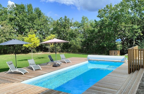 A wooden house, a blend of authenticity and refinement is located in Devillac. A wooden house, a blend of authenticity and refinement provides accommodation, featuring Pool, Balcony/Terrace, Security/Safety, among other amenities. This House features Pool, Balcony/Terrace, Security/Safety, to make your stay a comfortable one.