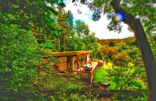 Newly refurbished this year with bespoke furnishings, this spectacular lodge boasts an extensive glass wall frontage designed to bring the natural light, surrounding forest and meadows directly into the home, blending the inspiring landscape with the interiors. The whole front of the lodge can be opened up with sliding glazed doors to bring in the forest and the stars. Look at the video of the dinner table set and ready to dine inside, out or both.