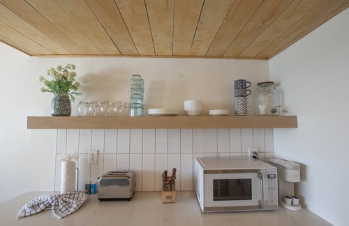 The cozy kitchen has everything you’ll need to make meals at home. The kitchen has updated cabinetry, quartz counters, and a beautiful wood ceiling. We have everything fully stocked with quality dishes, pots and pans and full sized appliances. You’ll enjoy meals at the breakfast bar!