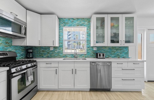 Spend your New Smyrna Beach vacation in the cute, family-friendly Barefoot Bungalow! A 3-bedroom 2-bath house right across the street from the crashing waves and warm sand. In addition to being right by the ocean, you and yours will love how it is only a 6-minute walk from restaurants, bars, and shopping on Flagler Avenue. Upon walking in you'll be welcomed by the home's bright interior full of white, teal, and wood accents. The kitchen is fully stocked with cookware, dinnerware, a toaster, a drip coffee maker, and more. Tucked beneath the island are a Full-Size Washer and Dryer. From the living room your cozy spot, you'll also have a full view of the backyard. The backyard is fenced-in and provides children with a safe outdoor space to play. At the end of each beach-filled day, you'll be more than ready to retire to the primary bedroom. This bedroom holds a queen bed and looks directly onto the ocean horizon. We recommend waking up early to watch the ocean sunrise from the bedroom's private 2nd-floor balcony! The nearby bathroom is beautifully updated and provides guests with a standard bathtub. The second and third bedrooms each provide a TV and sleep two guests with their respective queen beds and twin beds. The bedrooms share a bathroom that has a shower. Come see why Barefoot Bungalow a favorite vacation spot is.