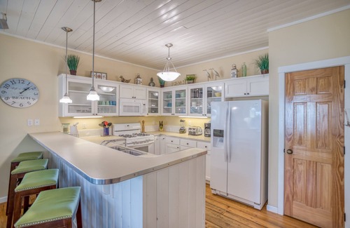 This graceful home has its great room on the second floor, where you’ll gain some altitude and improve your attitude as you relax on the front deck and gaze out at the sea. Sunset’s honeyed pine floors, spacious rooms and white plank ceiling present a contemporary living room space with a central gas fireplace and TV. Open the door to the deck and listen to the ocean a few hundred yards to the west. A fully equipped kitchen with a gas range and pretty glass-fronted cabinets has all you’ll need to serve meals at the dining table for eight; there’s a gas barbecue just outside to increase your menu options. A gorgeous king suite with access to the deck adjoins the great room, with ocean-view windows and lots of sun.