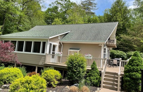 Close to the Lake George village, yet surrounded by trees and forest, The A-Frame Adirondack Cape features a three-seasons porch, wrap around tree deck for outdoor dining and large outdoor fire pit. There's a stream with a bridge that runs across the front entrance. The upstairs balcony has a two-person table and a coffee bar to enjoy the morning looking outdoors. Downstairs is is an entertainment space with a pullout sofa bed, television, dart game, foosball, air hockey, board games and more. Just down the road is the Gurney Lane Recreation Center and Gooney Golf and the Lake George village is a 7 minute drive away.