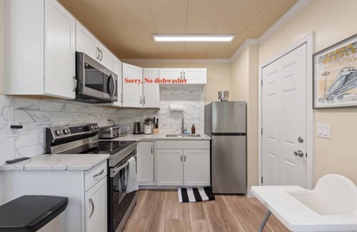 This cute house has 1 king-bedroom home with 1 full bathroom(inside the bedroom) and 2 twin beds(42"W x 78.5"D) in living area separately, perfectly for a couple or one family group with kids. There is no dishwasher. The laundry room is next to main entrance. It has natural Skylight and all floor to ceiling windows, very cozy and a yard with old trees for shades too. Walking to downtown is the most lovely part. Walking your pets or jogging, very close to beach park and everything.