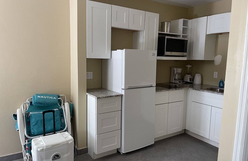 This is 534 sq. ft., STUDIO unit, with a full kitchen and bathroom. The kitchen is equipped with a countertop stove, refrigerator, microwave, and an oven. This quaint space, has a fully functioning work space, that doubles as a place for dining. This unit extends out into the garden where there is a pair of designated loungers for each unit. A coin operated onsite laundry facility, which serves 5 other similar units, offers convenience to our valued guests.