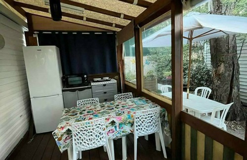 Mobile home with 2 bedrooms: 1 double bedroom, 1 bedroom with two single beds, kitchen, separate WC, shower room, covered terrace with garden furniture. Shaded location in the center of the campsite.
