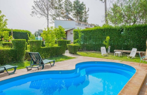 The exterior of the house has a private pool, perfectly maintained garden with lush vegetation and high hedges, and a pergola with outdoor dining.