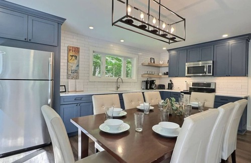 Inside, you`ll find four cozy bedrooms: a King suite with an en suite bathroom, two Queen rooms, and a fourth room with a Queen bed and a twin bunkbed. A second full bathroom serves the remaining bedrooms. The renovated kitchen is fully stocked and opens to a dining area with seating for 8, ideal for shared meals after a day on the slopes.