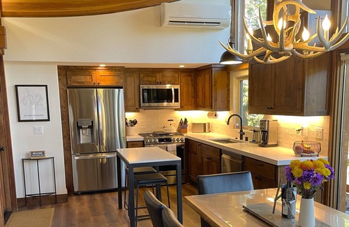 The brand new custom kitchen includes brand new stainless steel appliances, plenty of pots, pans, and dishware, as well as a coffeemaker and toaster located on modern quartz countertops. The home also has a full washer/dryer on the main level, perfect for drying out your ski gear or running that extra load of laundry during your stay.