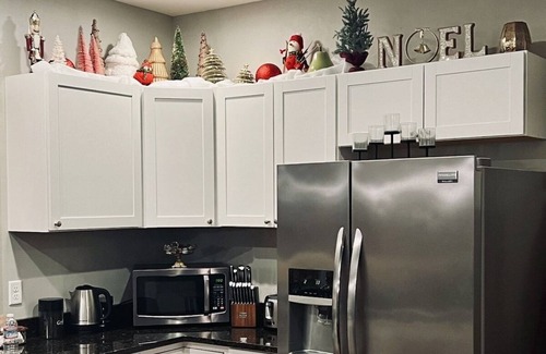 With four bedrooms, three baths, and sleeping for ten, it's the perfect choice for family vacations and small group retreats. This cozy, two-story home boasts central heating, air conditioning, high-speed fiber internet, and smart TVs for your convenience. Login to your streaming apps just as you would at home. The main level features two bedrooms, one with a queen bed, the other with a king and a queen bed, a shared bathroom, laundry room, and three-car garage. Upstairs, the great room provides a comfortable gathering space with a 75” Samsung Frame Smart TV and electric fireplace. The master suite offers a king-size bed, walk-in closet, 43" Smart LED TV, and ensuite bath with soaking tub and walk-in shower, while the guest suite includes a king-size bed and walk-in closet, 43" Smart LED TV, with a common space, full bathroom nearby. There is one motion activated, A/V, recording camera at this property with view of the driveway. There are no cameras in personal spaces.