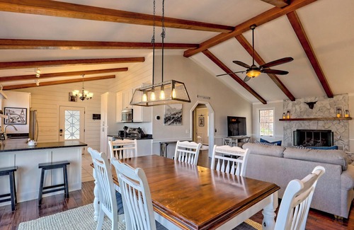 The main living area features a cozy gas fireplace, large TV, and comfy seating for movie nights or rainy-day lounging. The kitchen comes fully stocked with essentials—including a Keurig, crock pot, blender, and stock pot—perfect for cooking up a hearty post-hike meal.