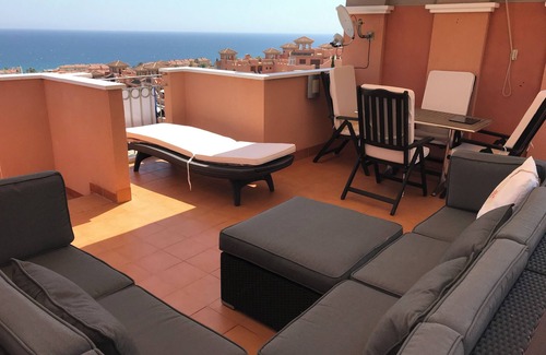 Mar Vista Penthouse apartment is in a secure urbanisation with electric security gates. It has free parking and is accessed by a flight of 15 steps. Totally Tranquil Holiday with Sun, Sea Mountains for company. Very Spacious upper a lower terracing with upper terrace having 360 degree views of sea and mountains. The lower terrace has 180 degree view of them. The apartment also overlooks the communal pool and gardens , so you family are in sight should you not wish to join them there. It is only a stones through away. The lounge is spacious with a three and two seater sofa. You are home from home with Premium tv channels and wifi. The kitchen has all you need should you wish to have a night in cooking utilising the dining table for four. There is a south facing sea view bedroom with standard size double bed, built in wardrobes and en-suite toilet, bath and shower. A small hallway leads you to the second bathroom and then the second bedroom. It has a west facing sea view and two single beds. The apartment has modern decor throughout. There is a small utility room off the lower terrace which houses the washing machine and cleaning utensils. You can either relax and chill holiday with little to no disturbance except for the main holiday months of July and August when it is a vibrant locality, whether you know the area or not. If you don’t then there is plenty of beaches, restaurants to discover. You will need a vehicle to get around easily. The elegant city of Cartagena is close by as is the city of Murcia. You will not be disappointed holidaying here.