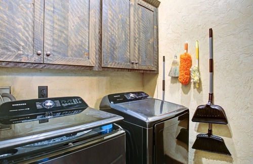 Relax in the cozy living room hosting five as you stoke a wood-burning, stacked stone fireplace complimented by the enormous flat-screen TV. The roomy dining area with bench-side seating comfortably accommodates six. The rustic Mediterranean-style chandeliers bring together the entire cabin’s rustic-modern look and feel. The wide hallway sports a convenient half bath and separate laundry closet with all new washer/dryer units.