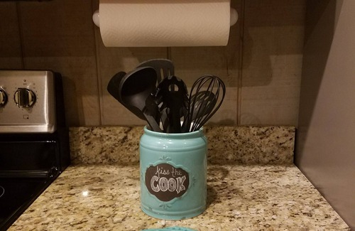KITCHEN: Fully stocked kitchen. Stainless steel appliances (dishwasher, refrigerator with water/ice in door, stove/oven, & microwave). Drip and Keurig coffee makers provided with starter supply of coffee, sugar, artificial sweetener, as well as coffee filters if you wish to bring your favorite coffee with you. Kitchen stocked with cooking utensils, pots, pans, casserole dishes, dishes, cups and eating utensils. Custom built farmhouse style dining table is located off the kitchen.