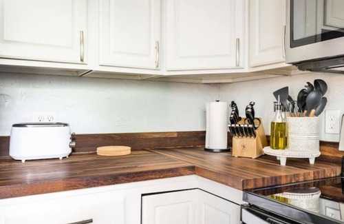 We have a fully stocked kitchen, with multi function Ninja Foodi, pots, pans, knives, spices, coffee and more. There are smart TV’s in every room, board games and cards in the living room and a large outdoor patio with fire pit.