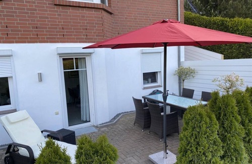 Located just outside Flensburg, our modern furnished 45 sqm apartment is located. Living area: High-quality pull-out sofa bed with 1.60 x2.00 m lying area, open kitchen with ceramic hob, microwave, toaster, coffee machine, etc. Bedroom: French double bed (1.40 x 2.00 m) Bathroom: Shower Storeroom: Washing machine, dryer By car you are in 10 minutes in the Flensburg city center and in 20 minutes you can enjoy a delicious hot dog in Denmark. At the same time you can also reach the different beaches of the Baltic Sea. Two bicycles are available for use free of charge. You can relax on your own private terrace. The garden is at your disposal. Children and dogs can fully develop here. It is a non-smoking apartment. It is important to us that you feel comfortable with us and enjoy the stay here.