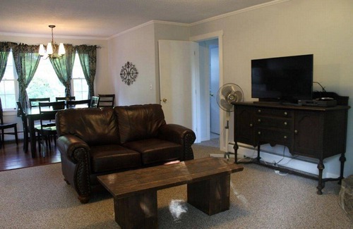 The apartment is reached via its own short staircase and deck. One enters into a great room with a living area, a full kitchen, and a dining table for 8. With soft leather couches and a large flat screen TV, the main room is perfect for relaxing after a long day outside. The kitchen area is compact but has everything you need, including a full sized oven and dishwasher, with the dining area immediately adjacent. A large stone hearth with electric fireplace/heater is the focal point of the room.