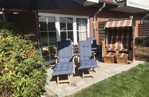 • Sleeping area 1 double bed, 1 sofa bed (s), cot to be rented: once 15 € • Kitchen area Coffee machine, kitchen utensils, dishwasher, grill, cooker, fridge, toaster, kettle, kitchen integrated in the living room, high chair can be borrowed: once 10 €, Nespresso coffee machine • Central heating • Outside (private) terrace, beach chair, 2 deck-chairs, garden chairs with table, umbrella, 2 bicycles available free of charge • Entertainment: DVD player, wireless internet, stereo, TV (satellite), radio • Sanitary facilities: hair dryer, shower, sink, walk-in shower, bed linen and towels for 15,00 € p. P, • Iron and Ironing Board • Miscellaneous: Vacuum Cleaner • Parking • Outdoor Parking (Shared) Garden for Laundry, Bike Shed (Lockable) Other Family Friendly, Pets Welcome, Smoking Not Allowed, Suitable for elderly or infirm, Aunt Helene has Children, Dogs (max 2), non-smoking, cyclists and North Sea and nature lovers welcome.