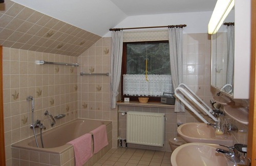 Welcome to the Haus der Ruhe. 2 bedrooms with double beds (1 box spring bed), additional sleeping possibility in the living room. 1 large bathroom with WC / bathtub / shower / washer-dryer / guest WC / spacious eat-in kitchen with dishwasher and microwave.