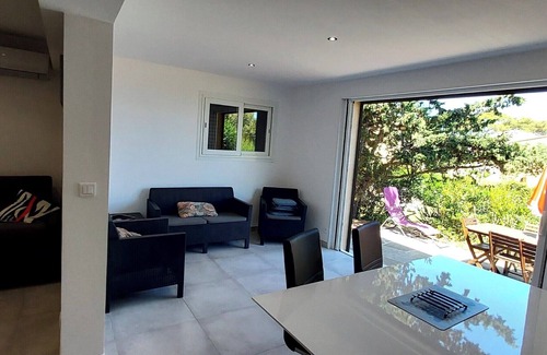 Apartment of 65 m2 completely redone, located between Calvi and L'île rousse in the town of Lumio in the Marine de Sant Ambroggio for 4 to 6 people. On the ground floor and in a quiet area, consisting of 2 bedrooms, 140 cm standard double bed, a bathroom with large Italian shower, separate toilet, fitted kitchen open to a double living room with sofa bed, dishwasher, washing machine, induction hob, microwave, TV, air conditioning.