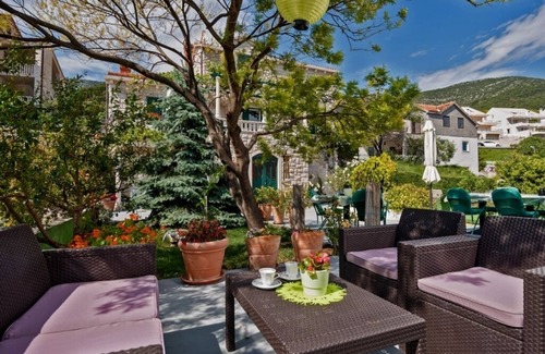 Enjoy an unforgettable holiday in this elegant holiday apartment in Bol on the sunny island of Brač. The apartment offers space for up to four people on 40 m² - ideal for couples, small families or friends. A separate bedroom with a double bed, a comfortable living kitchen with a sofa bed for two people and a modern bathroom with a shower ensure relaxed comfort. Sat-TV, WiFi and air conditioning complete the equipment, so you can feel at home. Pets up to 10 kg are welcome, so your little four-legged friend can also enjoy the holiday.The covered terrace with sea view invites you to have breakfast or enjoy cosy evenings outdoors. Table, chairs and parasol provide comfort, while direct access to the garden and the Hollywood swing guarantee relaxing moments. The brick outdoor grill can be used by arrangement, ideal for sociable barbecue evenings. A private parking space at the house ensures uncomplicated arrival.The location combines tranquillity and proximity to urban life: The centre of Bol, with its restaurants, cafés, supermarkets and shops, is just a few minutes' walk away. The beach is about 200 metres away and offers ideal access to pebble bays for swimming, sunbathing or water sports activities such as sailing, diving or kayaking. Bicycles can be used by arrangement, and numerous sports and leisure opportunities are in the vicinity – from mountain biking and hikes to wine tastings and cultural experiences.This charming holiday home amidst Mediterranean gardens offers a perfect combination of comfort, private retreat, and central location. Enjoy relaxed days by the sea and unforgettable evenings on your own terrace with direct access to the greenery.