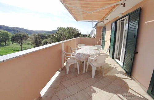 furnished south-facing terrace (30 m²) with some sea view, sunshade