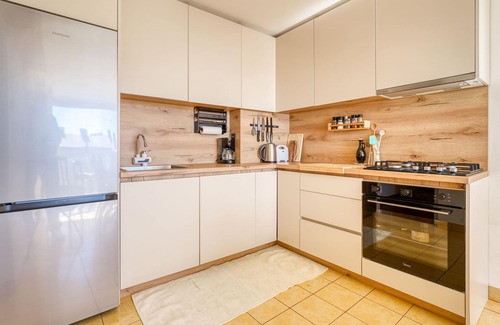 "Jana", 3-room apartment 60 m2 on 5th floor. Bright, partly renovated in 2024: living room with 1 sofabed (140 cm, length 200 cm), TV and air conditioning. 2 rooms, each room with 1 french bed (140 cm, length 200 cm). Kitchen (oven, dishwasher, 4 gas rings, toaster, kettle, freezer, electric coffee machine) with dining table. Bath/shower/WC. Forced-air heating. Panoramic view of the sea. Facilities: Internet (WiFi, free). Please note: non-smoking house. 1 small pet/ dog allowed.