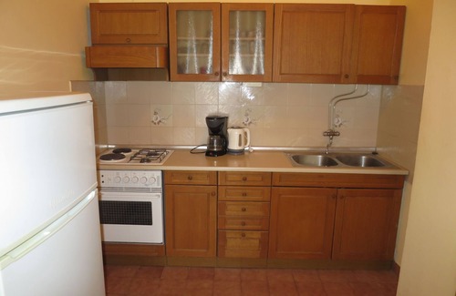 3-room apartment 55 m2 on 1st floor. Living/dining room with satellite TV (flat screen), air conditioning. Exit to the balcony. 1 room with 1 double bed (2 x 90 cm, length 200 cm). Exit to the balcony. 1 room with 2 beds (90 cm, length 200 cm). Open kitchen (4 hot plates, oven, toaster, kettle, freezer, electric coffee machine). Shower/WC. No heating option. Balcony. Balcony furniture. View of the sea and the bay. Facilities: Internet (WiFi, free). Please note: non-smoking house.